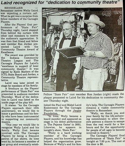 Wally first became involved with The Carnegie Players by being a frequent patron of our shows. As time went by, he became a member of our group and eventually established the Paul and Mabel Laird Endowment for The Carnegie Players through the Jasper Foundation. In time Wally became a board member and appeared in his debut performance in, The Pajama Game in 2001. Wally is a hardworking member of The Carnegie Players and his knowledge has helped the organization grow. Because of Wally's and his family's help, the Carnegie Players remains a viable community Theater in Rensselaer. Wally, we thank you and your family for the life-enhancing commitment to allow theatre patrons a chance to escape from the real world for a few hours and for the opportunity for people of all ages to become involved in theatre."